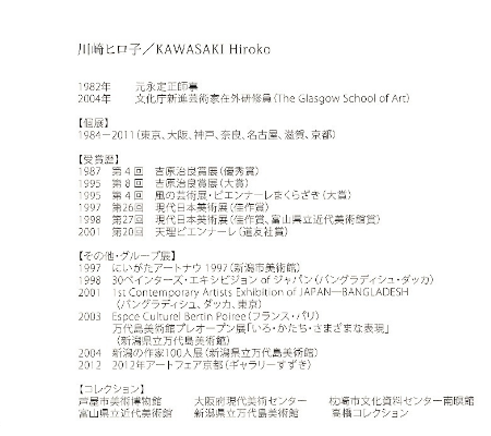HOME > Feature8 川崎ヒロ子展 [2012.10.08-17] 川崎 ヒロ子 / Hiroko Kawasaki (かわさき ひころ) Profile/ Feature7 123456789101112131415161718192021222324252627282930313233343536373839404142434445464748495051525354555657585960616263646566676869707172737475767778798081828384858687888990 Feature9 Event 蓮加都子 陶展 羅介の福童子染付器展 小島憲二陶展 リングワンダリング Taguiな日常 長岡國人展 元永紅子 田中小枝 陶展 川嶋守彦 個展 片山雅美–陶展– 蓮 善隆 作陶展 中野英一遺作展 彫刻 三人展 中村ミナトのジュエリー 光島和子ガラス展 沓沢佐知子作品展 小島憲二陶展 陶彫 高山光 元永定正100点展 杉井観峯展 川嶋守彦・元永紅子展 関根正文 金工展 山本莞二・鈴木律子 彫刻展 光島和子 ガラス展 蓮善隆作陶展 片山雅美陶展 小島憲二 熊谷 誠 田中小枝展 高北幸矢展 長谷川浩子展 片山雅美陶展 竹田安嵯代展 寄神千恵子陶展 光島和子ガラス展 山本莞二・鈴木律子 彫刻展 小島憲二陶展 羅介・辻恵子の二人展 杉井観峯展 元永定正とその家族展 長岡國人展 中村ミナト展 蓮善隆作陶展 太平和正展 羅介の福童子染付器てん NH展 村山幸子 植松永次 WERK-STATT N組 片山雅美 光島和子 夢ノ随二+三角帽子の世界 鷲津民子 山田喜代春 小島憲二 志村高弘 熊谷 誠 安藤栄作 竹田安嵯代 羅介の福童子染付器てん 小牧鉄平 陶展–情景– NH6展 寄神宗美 岡崎ゆみこ 伊藤宏美・ヒーロー伊藤 片山 雅美 川嶋守彦・元永紅子 内藤絹子 群 和子 猪熊克芳 新 佳三 谷本 貴 蓮 善隆 光島和子 竹田安嵯代 小島憲二 杉井観峯 川崎ヒロ子 高山 大 長岡國人 片山雅美 笹山忠保 宮本 治・宮本京子 谷本 景 太平和正 Schedule