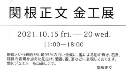 HOME > Feature65 関根正文 金工展 [2021.10.15-10.20] Feature64 12345678910111213141516171819202122232425262728293031323334353637383940414243444546474849505152535455565758596061626364656667686970717273747576777879808182838485868788899091 Feature66 Event 光島和子ガラス展 蓮加都子 陶展 羅介の福童子染付器展 小島憲二陶展 リングワンダリング Taguiな日常 長岡國人展 元永紅子 田中小枝 陶展 川嶋守彦 個展 片山雅美–陶展– 蓮 善隆 作陶展 中野英一遺作展 彫刻 三人展 中村ミナトのジュエリー 光島和子ガラス展 沓沢佐知子作品展 小島憲二陶展 陶彫 高山光 元永定正100点展 杉井観峯展 川嶋守彦・元永紅子展 関根正文 金工展 山本莞二・鈴木律子 彫刻展 光島和子 ガラス展 蓮善隆作陶展 片山雅美陶展 小島憲二 熊谷 誠 田中小枝展 高北幸矢展 長谷川浩子展 片山雅美陶展 竹田安嵯代展 寄神千恵子陶展 光島和子ガラス展 山本莞二・鈴木律子 彫刻展 小島憲二陶展 羅介・辻恵子の二人展 杉井観峯展 元永定正とその家族展 長岡國人展 中村ミナト展 蓮善隆作陶展 太平和正展 羅介の福童子染付器てん NH展 村山幸子 植松永次 WERK-STATT N組 片山雅美 光島和子 夢ノ随二+三角帽子の世界 鷲津民子 山田喜代春 小島憲二 志村高弘 熊谷 誠 安藤栄作 竹田安嵯代 羅介の福童子染付器てん 小牧鉄平 陶展–情景– NH6展 寄神宗美 岡崎ゆみこ 伊藤宏美・ヒーロー伊藤 片山 雅美 川嶋守彦・元永紅子 内藤絹子 群 和子 猪熊克芳 新 佳三 谷本 貴 蓮 善隆 光島和子 竹田安嵯代 小島憲二 杉井観峯 川崎ヒロ子 高山 大 長岡國人 片山雅美 笹山忠保 宮本 治・宮本京子 谷本 景 太平和正 Schedule