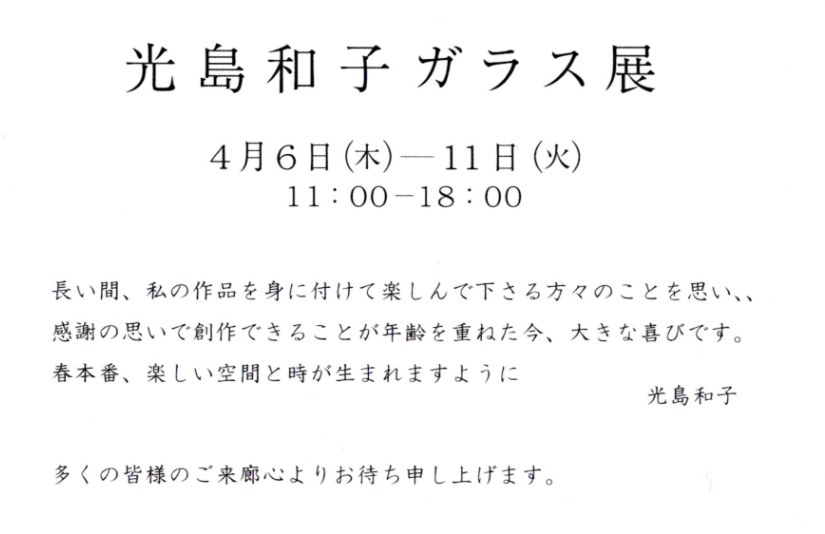 HOME > Feature72 光島和子ガラス展 [2023.04.06-04.11] Feature71 123456789101112131415161718192021222324252627282930313233343536373839404142434445464748495051525354555657585960616263646566676869707172737475767778798081828384858687888990 Feature73 Event 蓮加都子 陶展 羅介の福童子染付器展 小島憲二陶展 リングワンダリング Taguiな日常 長岡國人展 元永紅子 田中小枝 陶展 川嶋守彦 個展 片山雅美–陶展– 蓮 善隆 作陶展 中野英一遺作展 彫刻 三人展 中村ミナトのジュエリー 光島和子ガラス展 沓沢佐知子作品展 小島憲二陶展 陶彫 高山光 元永定正100点展 杉井観峯展 川嶋守彦・元永紅子展 関根正文 金工展 山本莞二・鈴木律子 彫刻展 光島和子 ガラス展 蓮善隆作陶展 片山雅美陶展 小島憲二 熊谷 誠 田中小枝展 高北幸矢展 長谷川浩子展 片山雅美陶展 竹田安嵯代展 寄神千恵子陶展 光島和子ガラス展 山本莞二・鈴木律子 彫刻展 小島憲二陶展 羅介・辻恵子の二人展 杉井観峯展 元永定正とその家族展 長岡國人展 中村ミナト展 蓮善隆作陶展 太平和正展 羅介の福童子染付器てん NH展 村山幸子 植松永次 WERK-STATT N組 片山雅美 光島和子 夢ノ随二+三角帽子の世界 鷲津民子 山田喜代春 小島憲二 志村高弘 熊谷 誠 安藤栄作 竹田安嵯代 羅介の福童子染付器てん 小牧鉄平 陶展–情景– NH6展 寄神宗美 岡崎ゆみこ 伊藤宏美・ヒーロー伊藤 片山 雅美 川嶋守彦・元永紅子 内藤絹子 群 和子 猪熊克芳 新 佳三 谷本 貴 蓮 善隆 光島和子 竹田安嵯代 小島憲二 杉井観峯 川崎ヒロ子 高山 大 長岡國人 片山雅美 笹山忠保 宮本 治・宮本京子 谷本 景 太平和正 Schedule